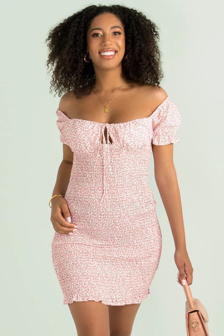 Total Summer vibes in our lovely Taya Dress! Made from the perfect floral print fabric in pink, she features elastic shoulders sleeves, frill detailing and a tie-up bust. She’s also shirred through the body for a comfy and cute fit! Style her with mules and and gold hoops for a gorgeous look that you can take from day to night!