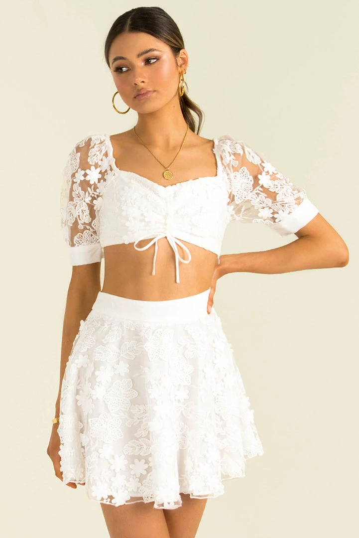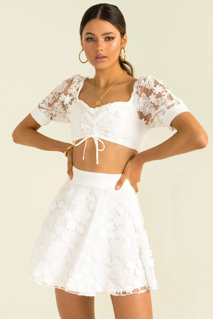 The prettiest little white top! Our stunning Dahlia Top is made from a white fabric with lovely floral appliqué detailing throughout. She’s a cropped style with cute puff sleeves and a drawstring detail at the bust. Style her with out matching Dahlia Skirt for the perfect party look!