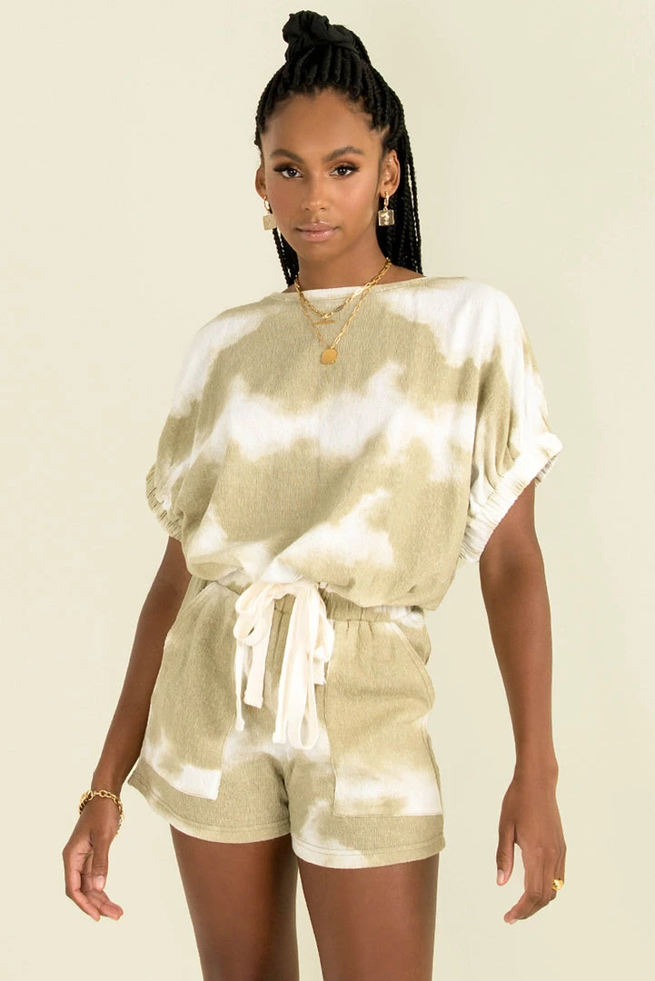 Cute and comfy in our gorgeous Pluto Top! This cool top is made from a olive and white print fabric and is a boxy fit with short wide sleeves, elastic detailing at the cuffs and hem and also a drawstring detail. We love it styled with out matching Pluto Shorts and sandals for the perfect off-duty look!