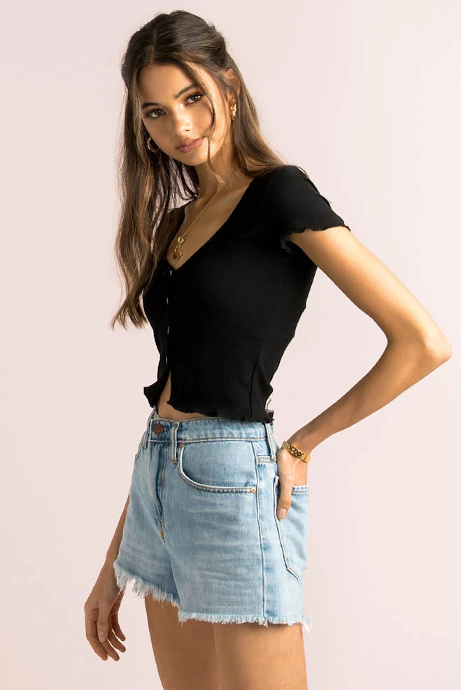 Melt hearts in our adorable Preston Top! This cute top is made from a ribbed fabric in black! It features a V-neckline, short sleeves and 4 button closures in the front. We love it styled with high-waisted denim for a cute and comfy weekend look.