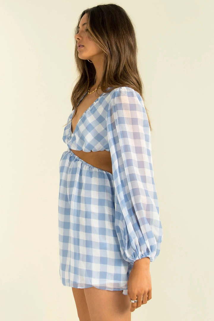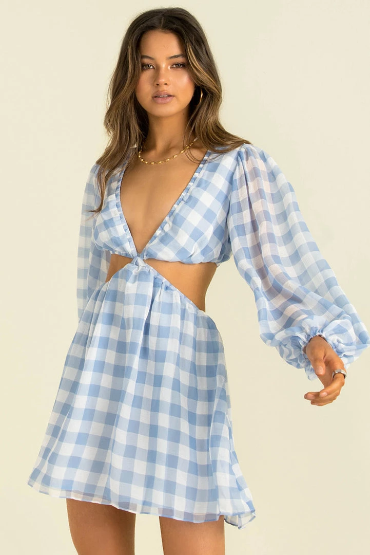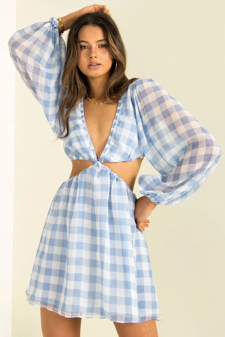 Designed to flatter, our gorgeous Tullia Dress has cutouts in all the right places! She’s made from a high-quality chiffon fabric in a blue and white check print. She features a v-neckline, long sleeves, cutouts at the waist and an a-line skirt. Style her with boots for the day or dress her up with strappy heels and a mini bag!