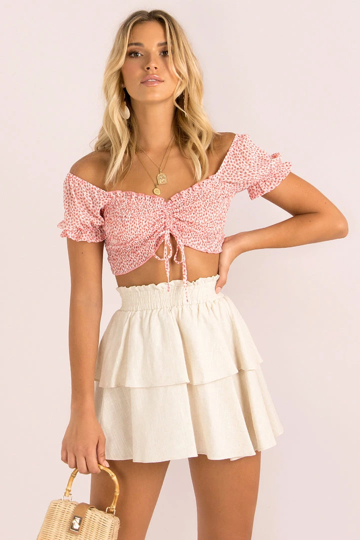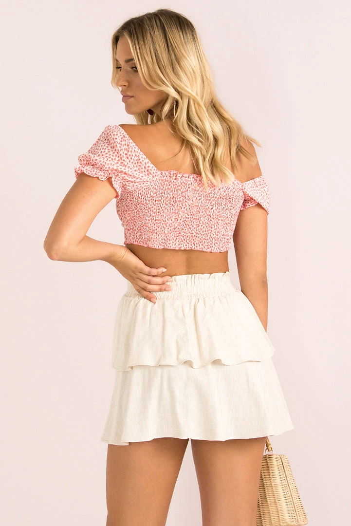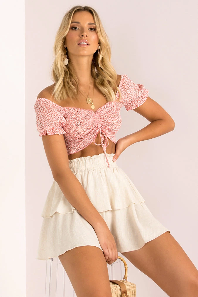 The perfect crop top that your wardrobe will love! She’s made from a Pink and White floral print fabric and features short sleeves, shirred fabric and a drawstring tie at the front. We love her styled with a high-waisted denim and sneakers for a cute weekend look!
