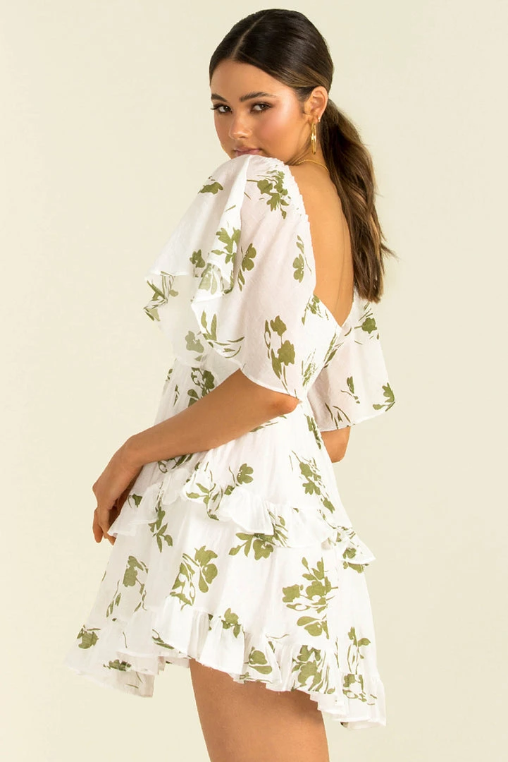 Easy breezy in our beautiful Zuri Dress! This lovely mini dress is made from a a high-quality fabric in white with a floral design throughout. She features a shirred elastic bodice, shirt flared sleeves and a full skirt with frill details. Style her with gold hoops, strappy heels and a mini bag for a Summer night out!